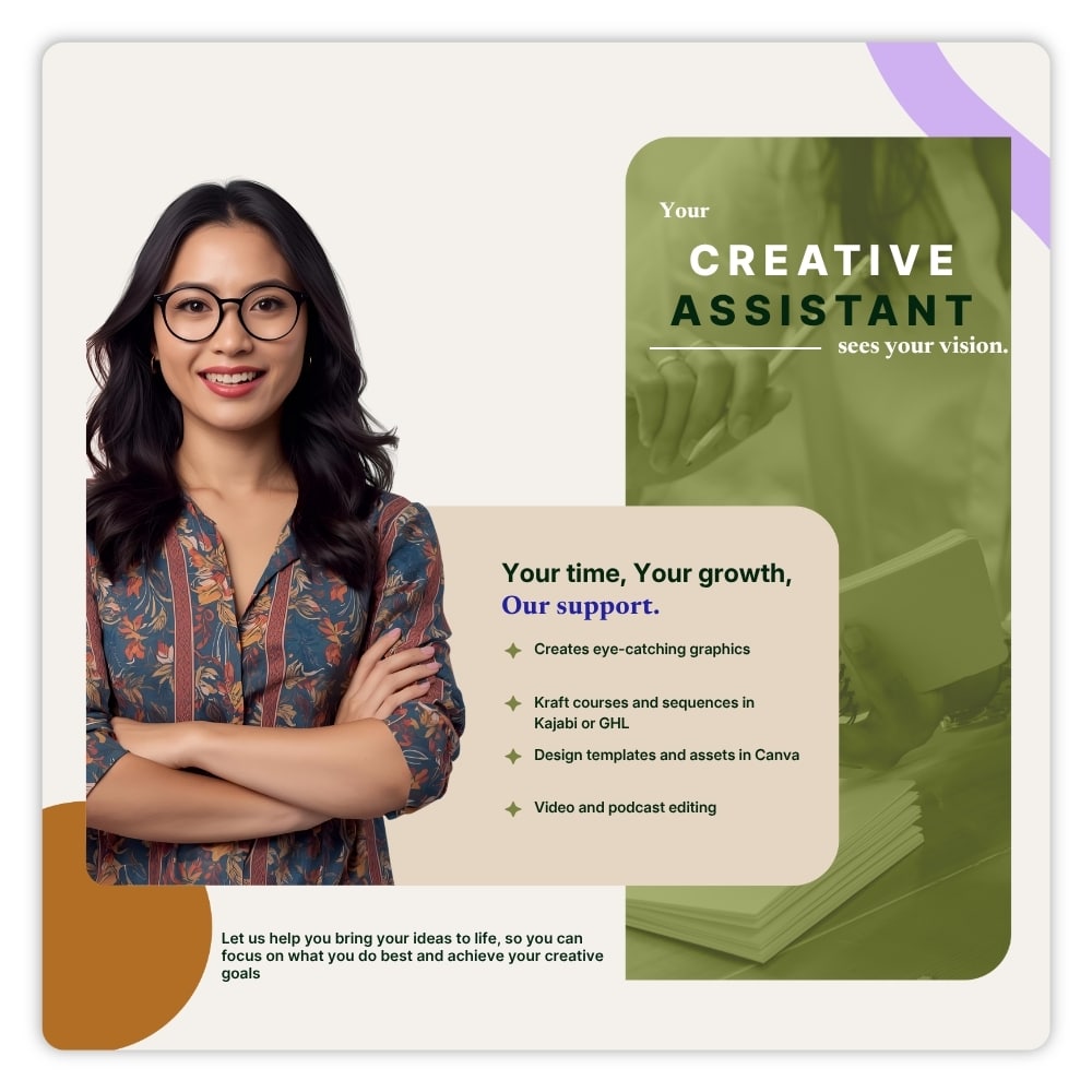 At Virtual Elves, we’ll connect you with a talented Creative Virtual Assistant who can help you design with purpose, plan with confidence, and bring your brand vision to life. From social media graphics to course content and website visuals, your Creative VA ensures every detail looks and feels aligned with your business.